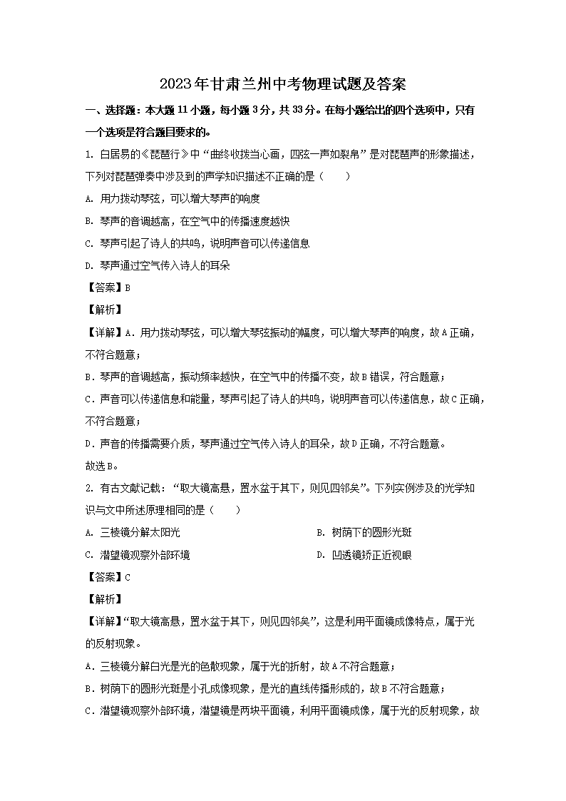 2023年甘肃兰州中考物理试题及答案(Word版)07-04