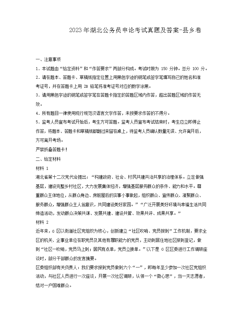 2023年湖北公务员申论考试真题及答案-县乡卷(Word版)09-28