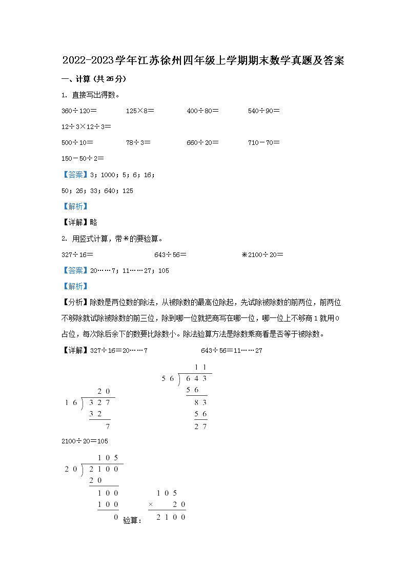 2022-2023学年江苏徐州四年级上学期期末数学真题及答案(Word版)09-07