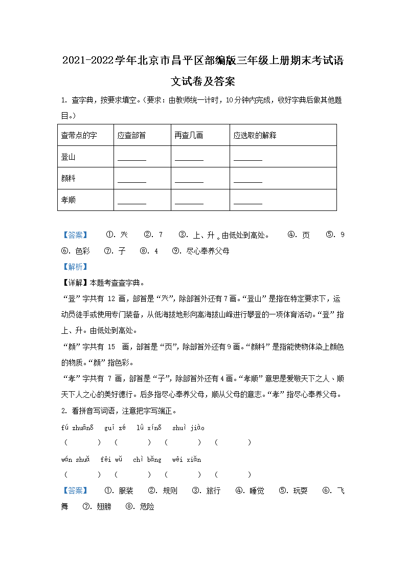 2021-2022学年北京市昌平区部编版三年级上册期末考试语文试卷及答案(Word版)07-01