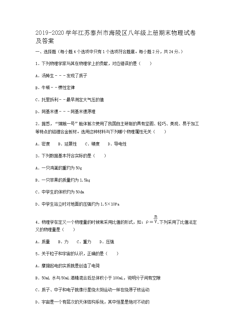 【文档预览】 文档大全网整理发布2019-2020学年江苏泰州市海陵区八年级上册期末物理试卷及答案(Word版),前五页预览如下: