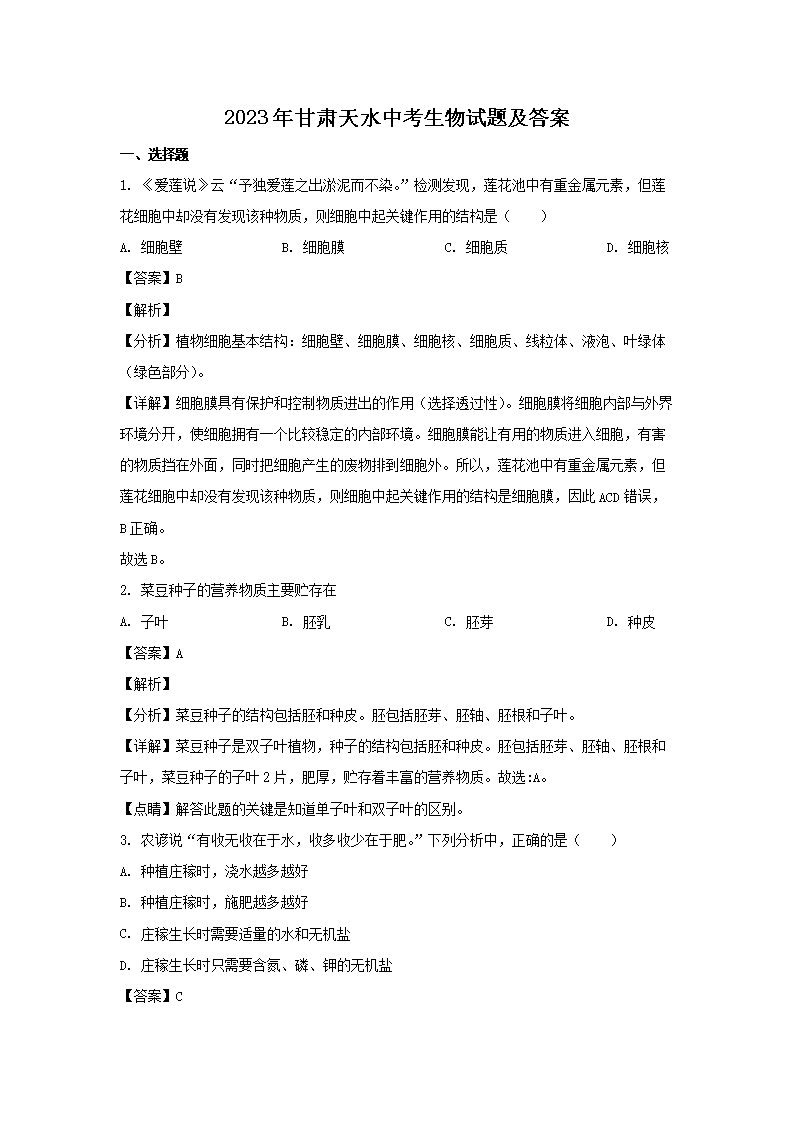 【文档预览】 文档大全网整理发布2023年甘肃天水中考生物试题及答案(Word版),前五页预览如下: