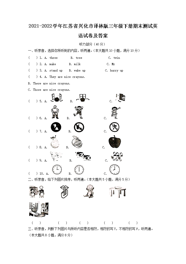 2021-2022学年江苏省兴化市译林版三年级下册期末测试英语试卷及答案(Word版)08-04