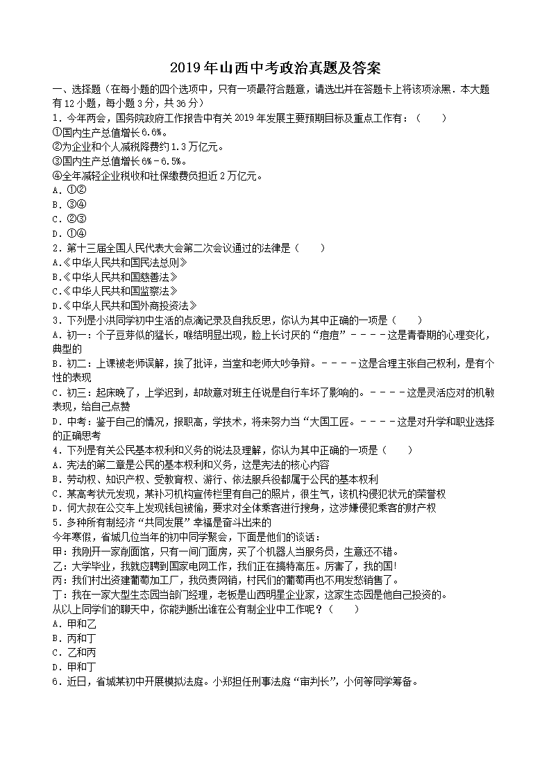 2019年山西中考政治真题及答案(Word版)05-30