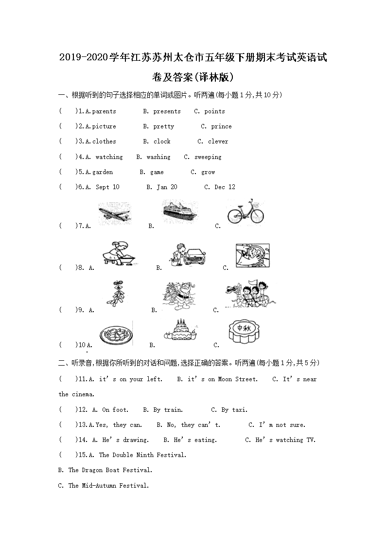 【文档预览】 文档大全网整理发布2019-2020学年江苏苏州太仓市五年级下册期末考试英语试卷及答案(译林版)(Word版),前五页预览如下: