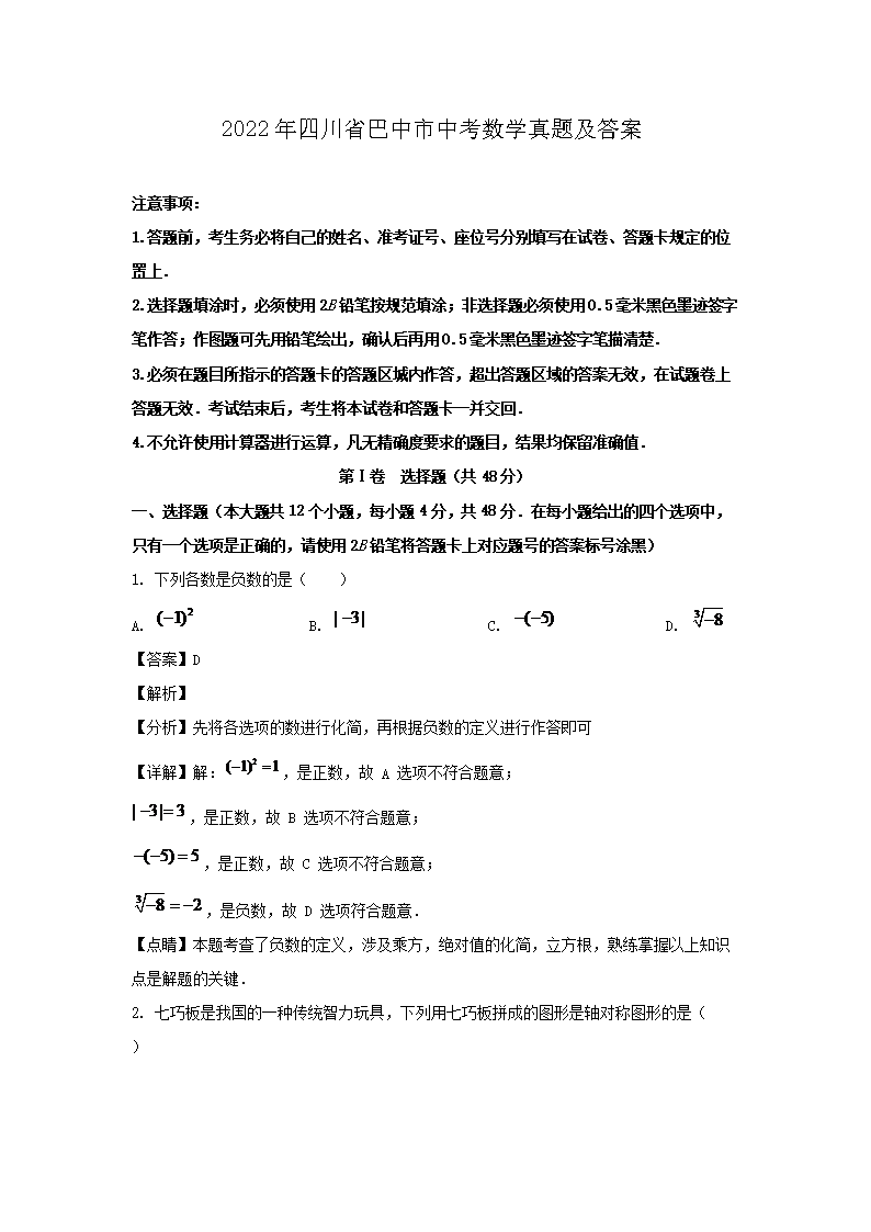 2022年四川省巴中市中考数学真题及答案(Word版)05-27