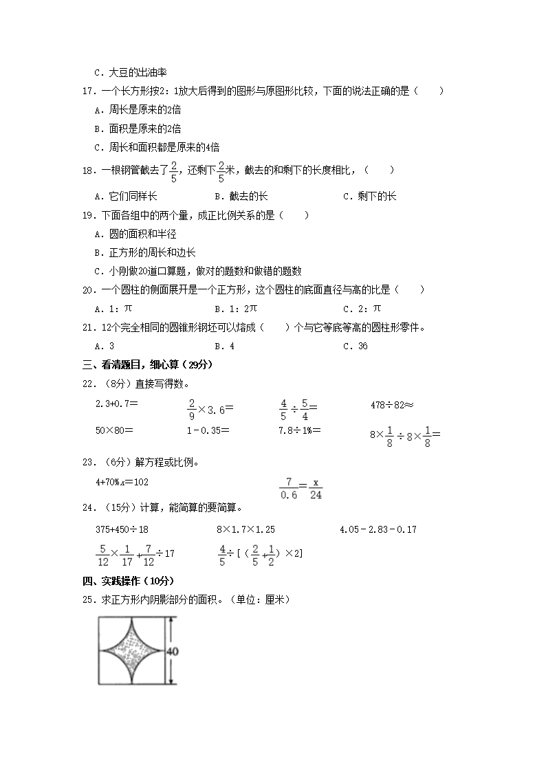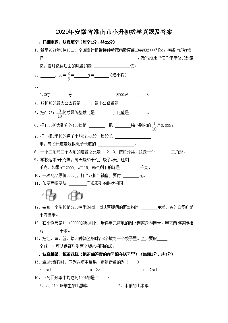 2021年安徽省淮南市小升初数学真题及答案(Word版)09-25