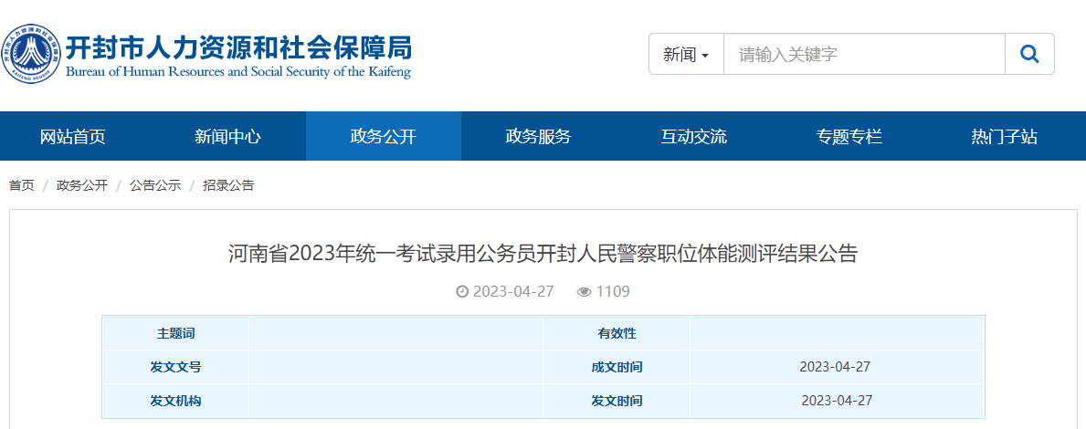2023年河公开封市公务员人民警察职位体能测评结果公告04-28