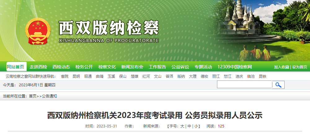 【#公务员考试# 导语】®文档大全网从西双版纳检察了解到,2023年云南西双版纳州检察机关公务员拟录用人员公示时间:5月31日-6月6日,相关事宜如下: