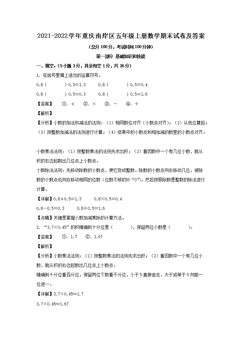 【文档预览】 文档大全网整理发布2021-2022学年重庆南岸区五年级上册数学期末试卷及答案(Word版),前五页预览如下: