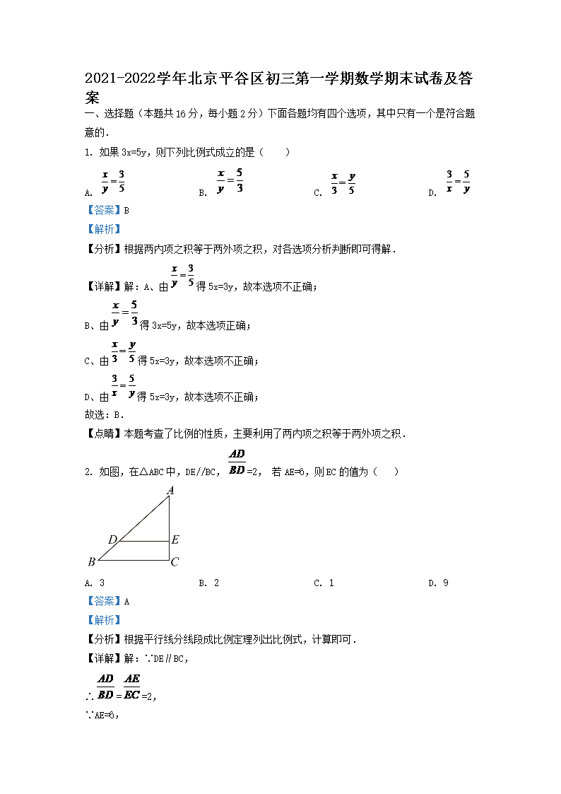 【文档预览】 文档大全网整理发布2021-2022学年北京平谷区初三第一学期数学期末试卷及答案(Word版),前五页预览如下: