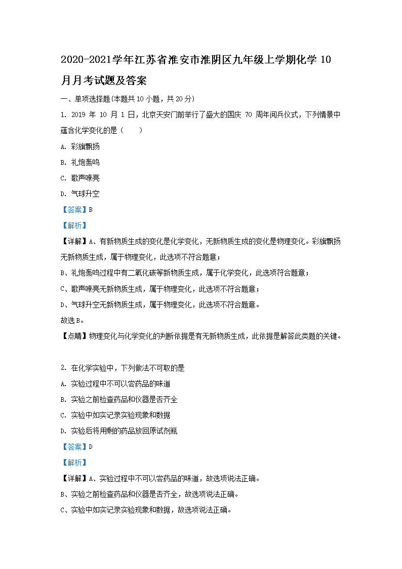 2020-2021学年江苏省淮安市淮阴区九年级上学期化学10月月考试题及答案(Word版)09-14