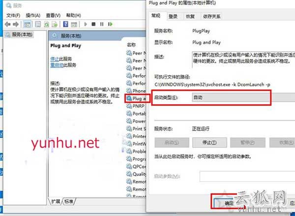 我们也可以在Win10进入“服务”进行操作,Win+R 打开运行窗口,输入命令 services.msc,并点击确定,就可以打开Win10服务了,我们找到一个名为“Plug and Play”服务项,看看这个服务有没有启动,如果没有启动,我们双击“Plug and Play”服务项,在启动类型选项中,修改为“自动”,点击确定即可。