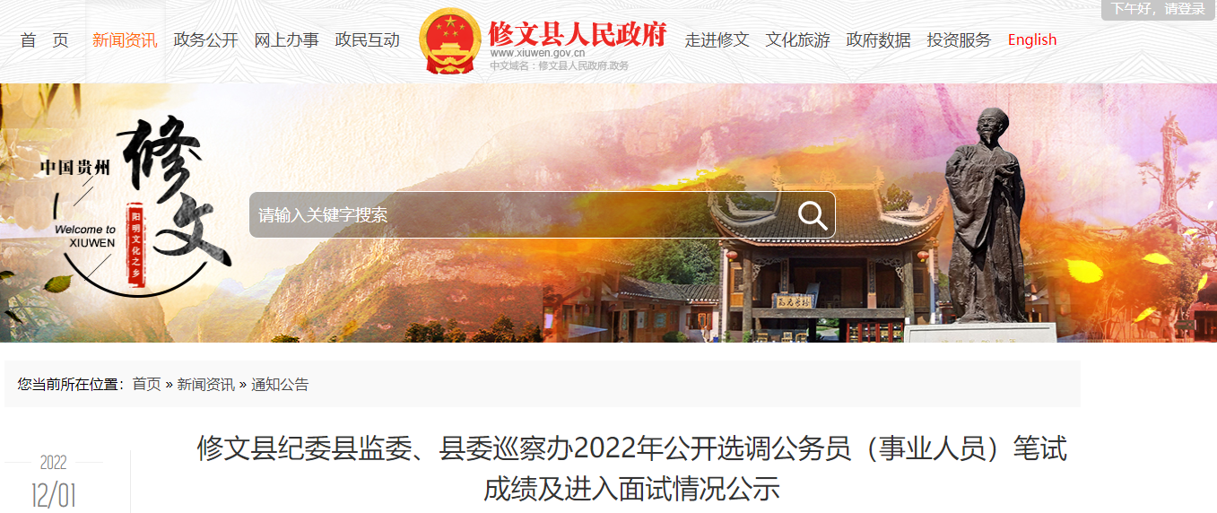 原文标题:修文县纪委县监委、县委巡察办2022年公开选调公务员(事业人员)笔试成绩及进入面试情况公示