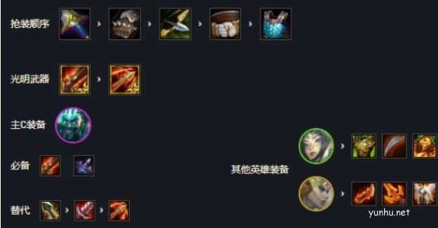 前期过渡三哨兵三神盾过渡,有德莱文的装备可以先给奥拉夫带,尽量打连胜。