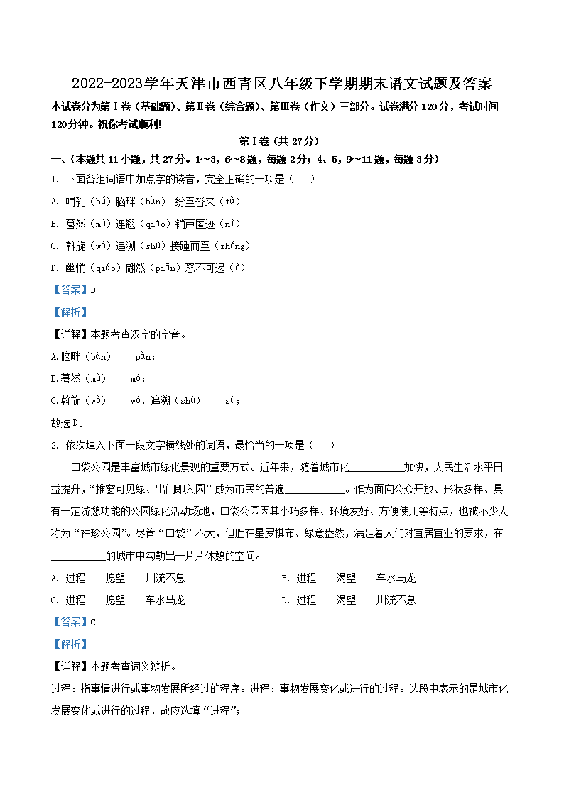 【文档预览】 文档大全网整理发布2022-2023学年天津市西青区八年级下学期期末语文试题及答案(Word版),前五页预览如下: