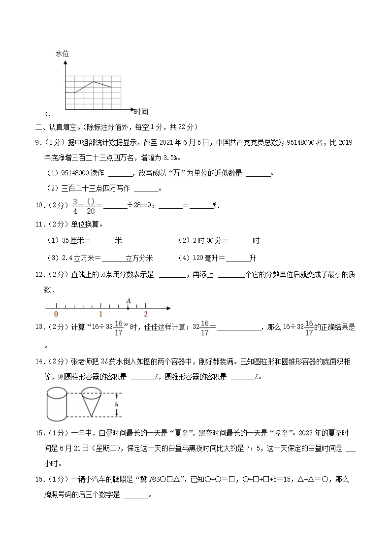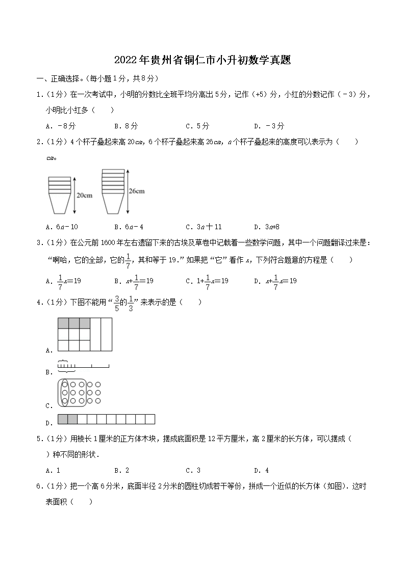 2022年贵州省铜仁市小升初数学真题(Word版)09-01