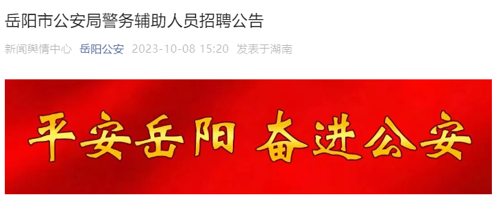 因工作需要,根据《湖南省警务辅助人员条例》和《岳阳市公安机关警务辅助人员管理办法》相关规定,岳阳市公安局与岳阳市人社局公开招聘警务辅助人员(以下简称辅警),特公告如下: