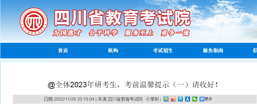 考研频道从四川省教育考试院了解到,四川省2023年全国硕士研究生考前温馨提示(一)已发布,相关考研考生可以登录四川省教育考试院(https://www.sceea.cn/Index.html)“最新动态”栏目进行查看和了解。
