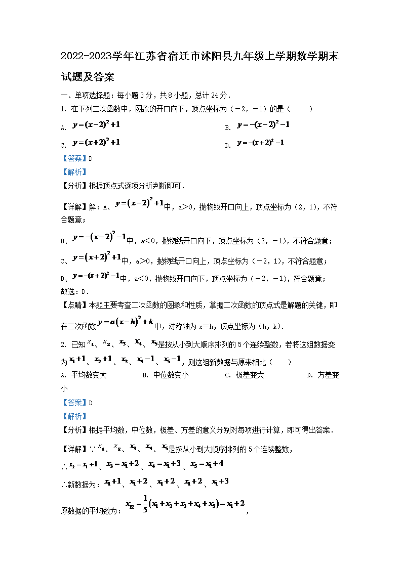 2022-2023学年江苏省宿迁市沭阳县九年级上学期数学期末试题及答案(Word版)09-26