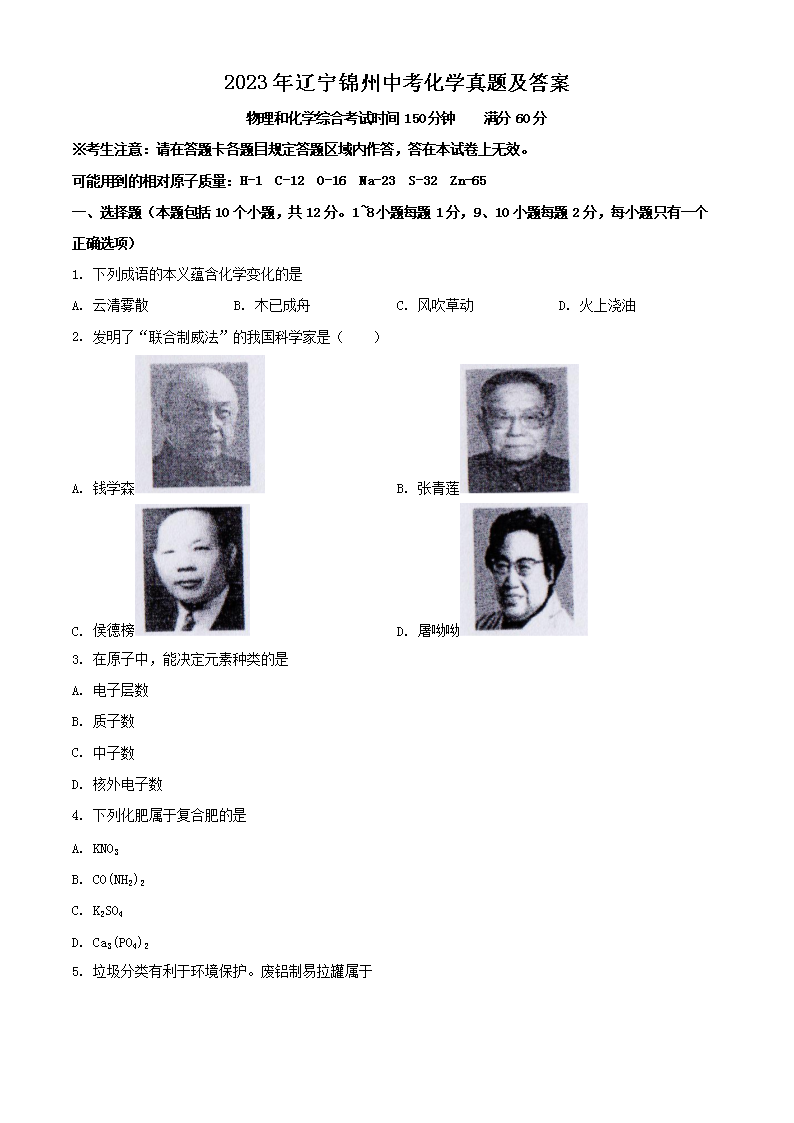 2023年辽宁锦州中考化学真题及答案(Word版)07-26