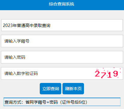 选择【2023年普通高中录取查询】,分别输入“学籍号”、“查询密码(身份证后6位数)”、“验证码”。