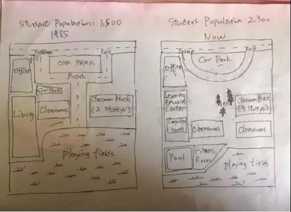 For the time being, learning resources centre and computer room have taken place of the library in 1985. What’s more, the smaller car par has been currently replaced by trees and the size of playing fields has been reduced. In addition to this, much space of playing fields has been used for the construction of pool and fitness room. Furthermore, the number of both classrooms and classroom block has increased by 1.