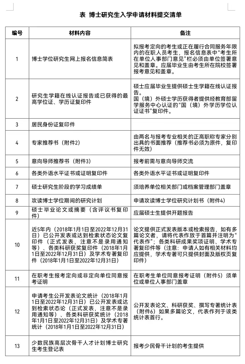 符合报考条件的人员须下载“博士研究生入学申请材料自查表”(附件1)。按“博士研究生入学申请材料提交清单”编号顺序整理材料,具体申请材料清单见下表,并在2022年12月15日17点前将申请材料和自查表寄送达我院研究生招生工作办公室。