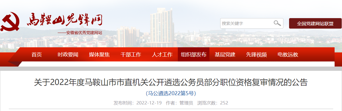 2022年安徽马鞍山市直机关公开遴选公务员部分职位现场递补资格复审时间:12月21日12-21