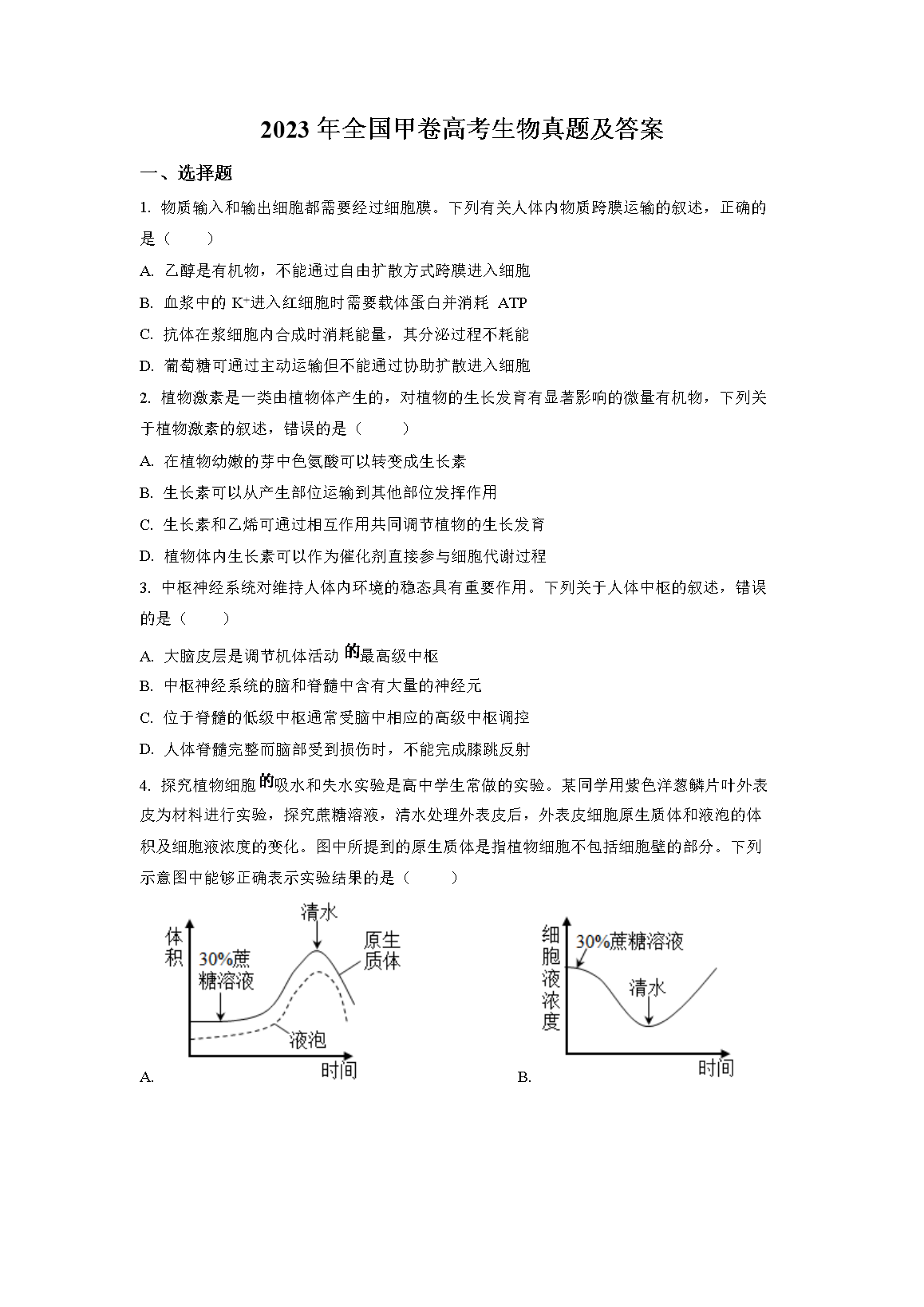 2023年全国甲卷高考生物真题及答案(Word版)06-10