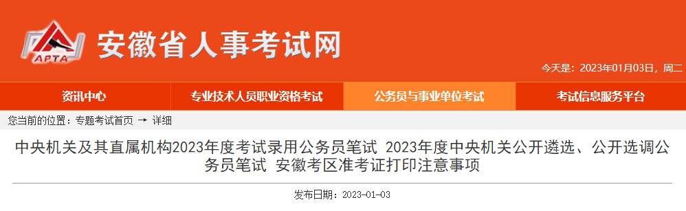 原文标题:中央机关及其直属机构2023年度考试录用公务员笔试 2023年度中央机关公开遴选、公开选调公务员笔试 安徽考区准考证打印注意事项