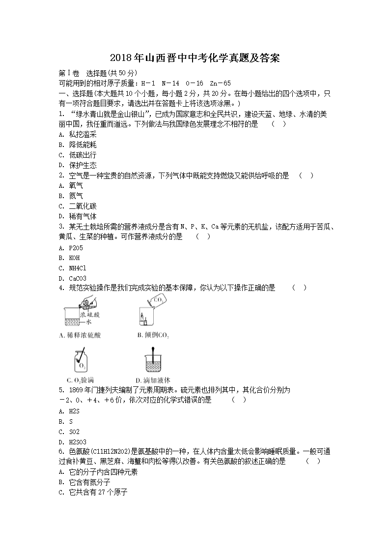 2018年山西晋中中考化学真题及答案(Word版)05-29