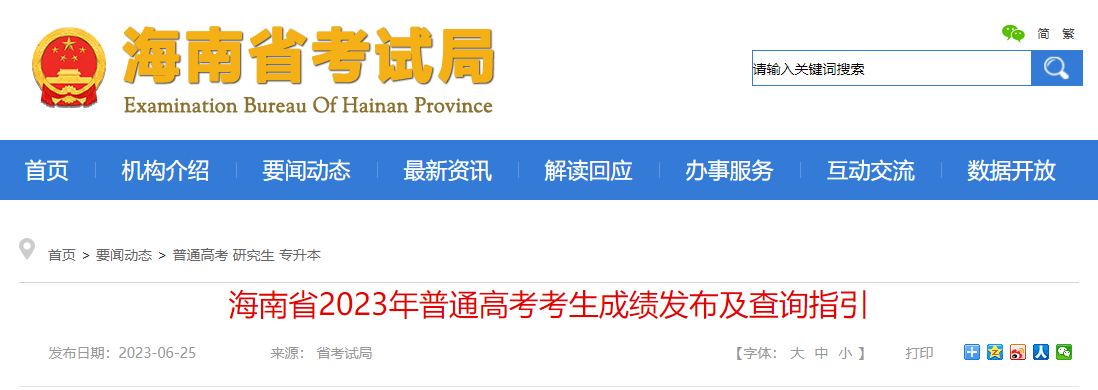 6月25日发布2023年海南省普通高考考生成绩。考生可通过海南省考试局官方网站等渠道查询成绩,自行下载并打印成绩单。