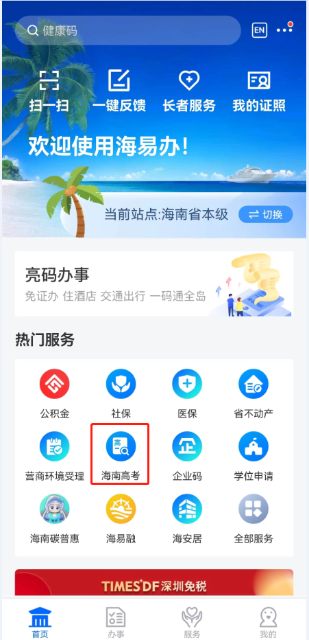 考生可通过手机登录“海易办”,点击“海南高考”图标查询。