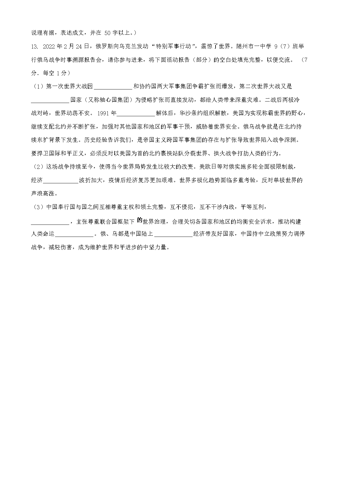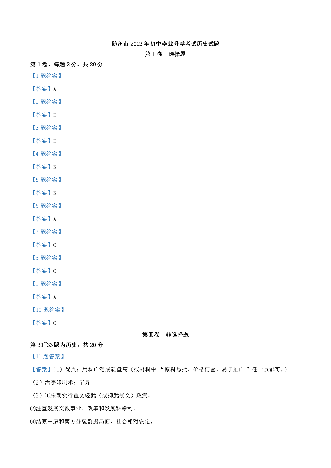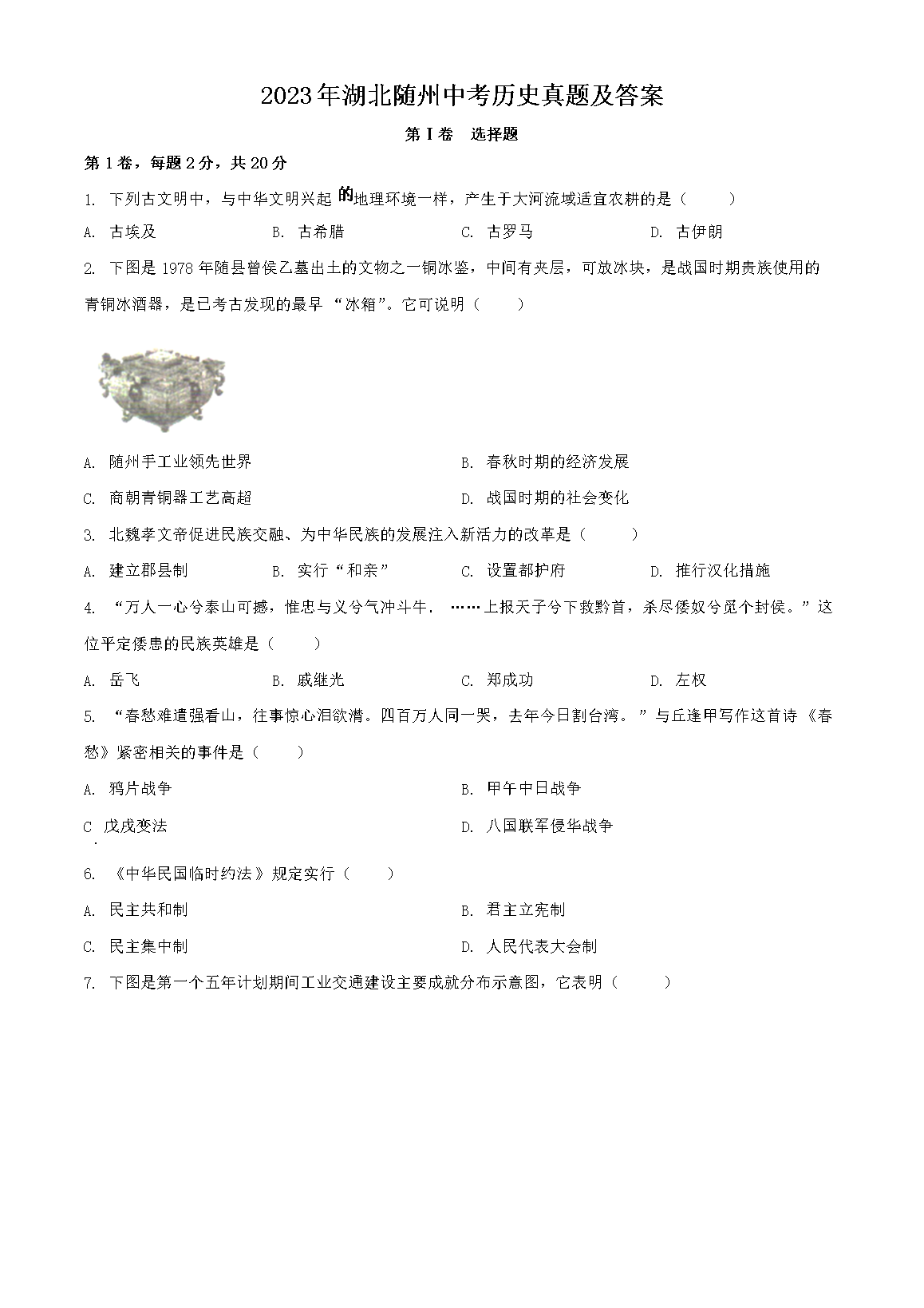 2023年湖北随州中考历史真题及答案(Word版)07-15