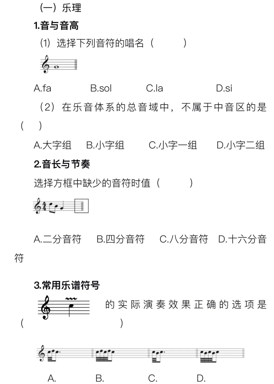 2.考试内容:音与音高、音长与节奏、常用乐谱符号、音程与和弦、民族调式与大小调式。
