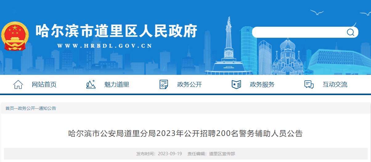 【#招警考试# #2023年黑龙江哈尔滨市公安局道里分局招聘警务辅助人员公告(200名)#】©文档大全网从哈尔滨市公安局道里区人民政府获悉,2023年黑龙江哈尔滨市公安局道里分局招聘警务辅助人员200名。报名时间:9月26日-28日,考试时间:另行通知,更多事宜请参考阅读《招聘公告》,官方公告原文如下: