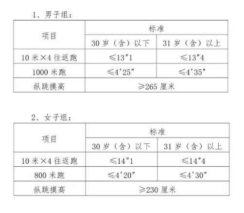 体能测试项目和标准: