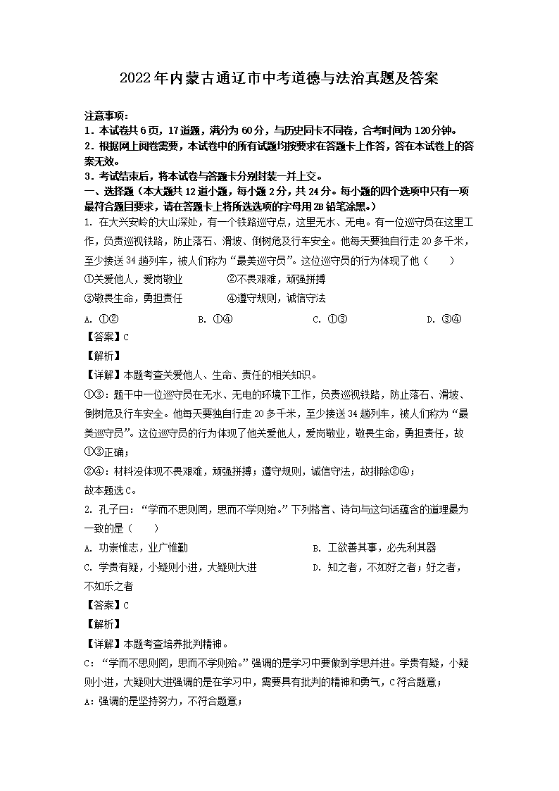 【文档预览】 文档大全网整理发布2022年内蒙古通辽市中考道德与法治真题及答案(Word版),前五页预览如下: