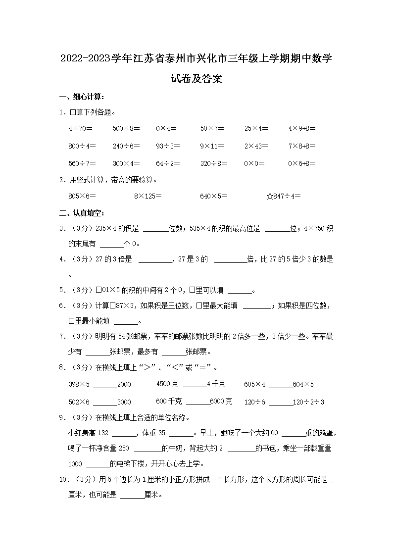 【文档预览】 文档大全网整理发布2022-2023学年江苏省泰州市兴化市三年级上学期期中数学试卷及答案(Word版),前五页预览如下:
