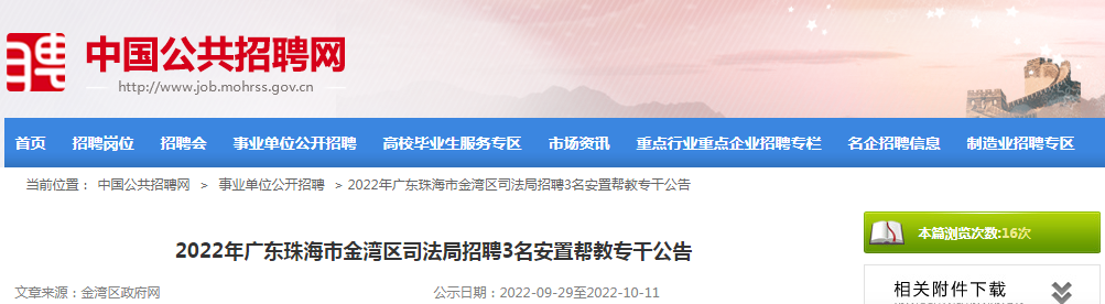 原文标题:2022年广东珠海市金湾区司法局招聘3名安置帮教专干公告