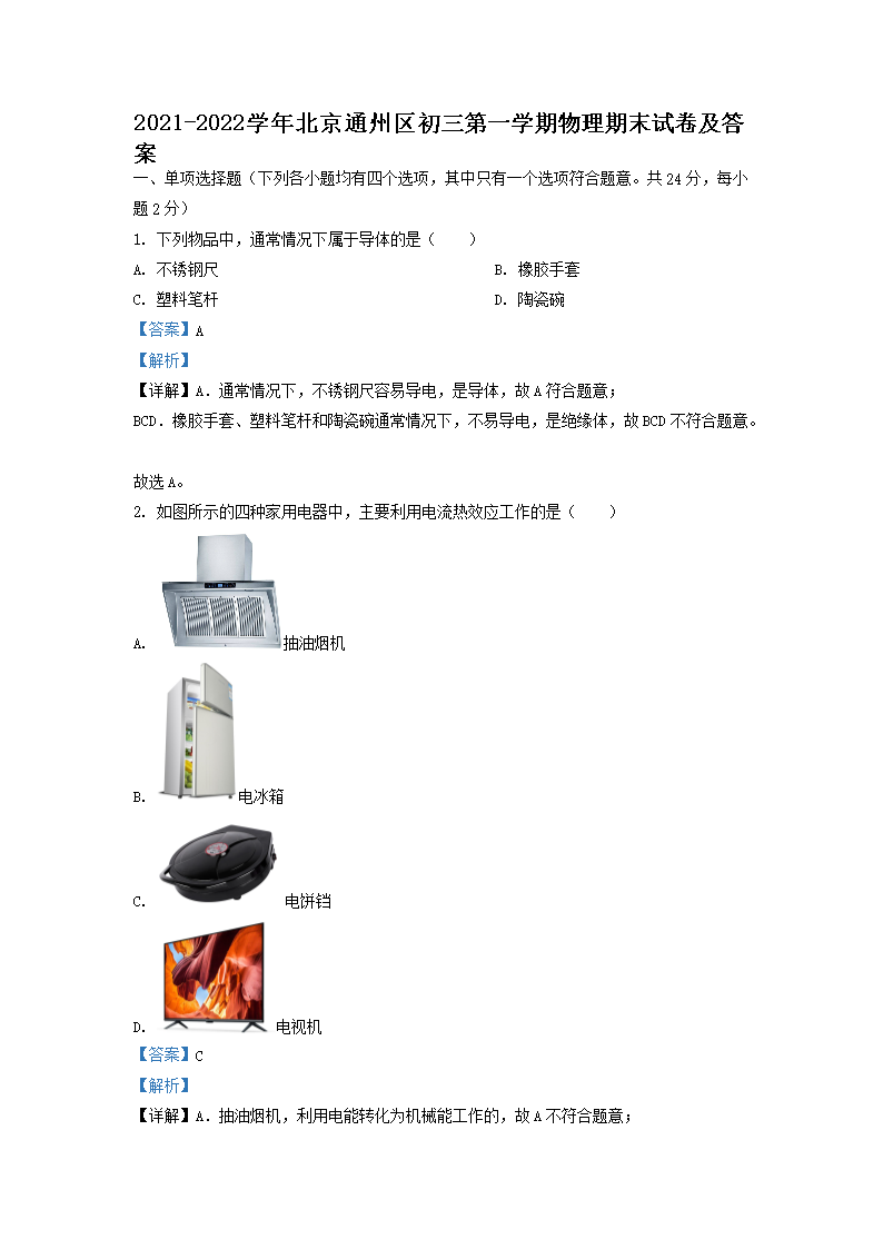 2021-2022学年北京通州区初三第一学期物理期末试卷及答案(Word版)07-13