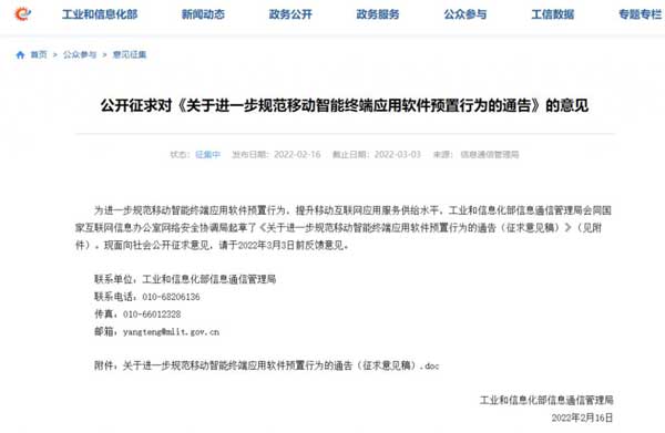 日前工信部公开征求对《关于进一步规范移动智能终端应用软件预置行为的通告》的意见。