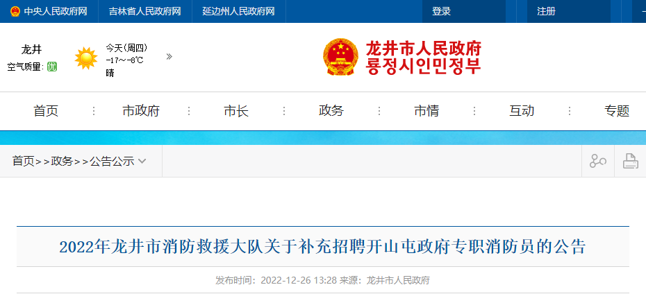 原文标题:2022年龙井市消防救援大队关于补充招聘开山屯政府专职消防员的公告