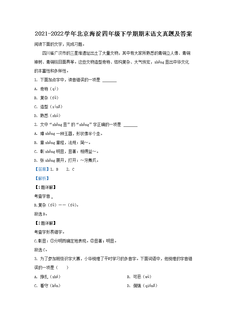 【文档预览】 文档大全网整理发布2021-2022学年北京海淀四年级下学期期末语文真题及答案(Word版),前五页预览如下: