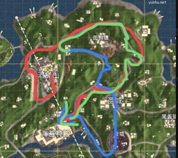 一般都是跳酒桶山,大概在红线的起点有一辆车,坐上那辆车然后按图中红色路线走,如果酒桶山有人对自己实力没信心的话可以跳到蓝绿线的起点那片野区,那片野区有人的话就跳没人的野区。