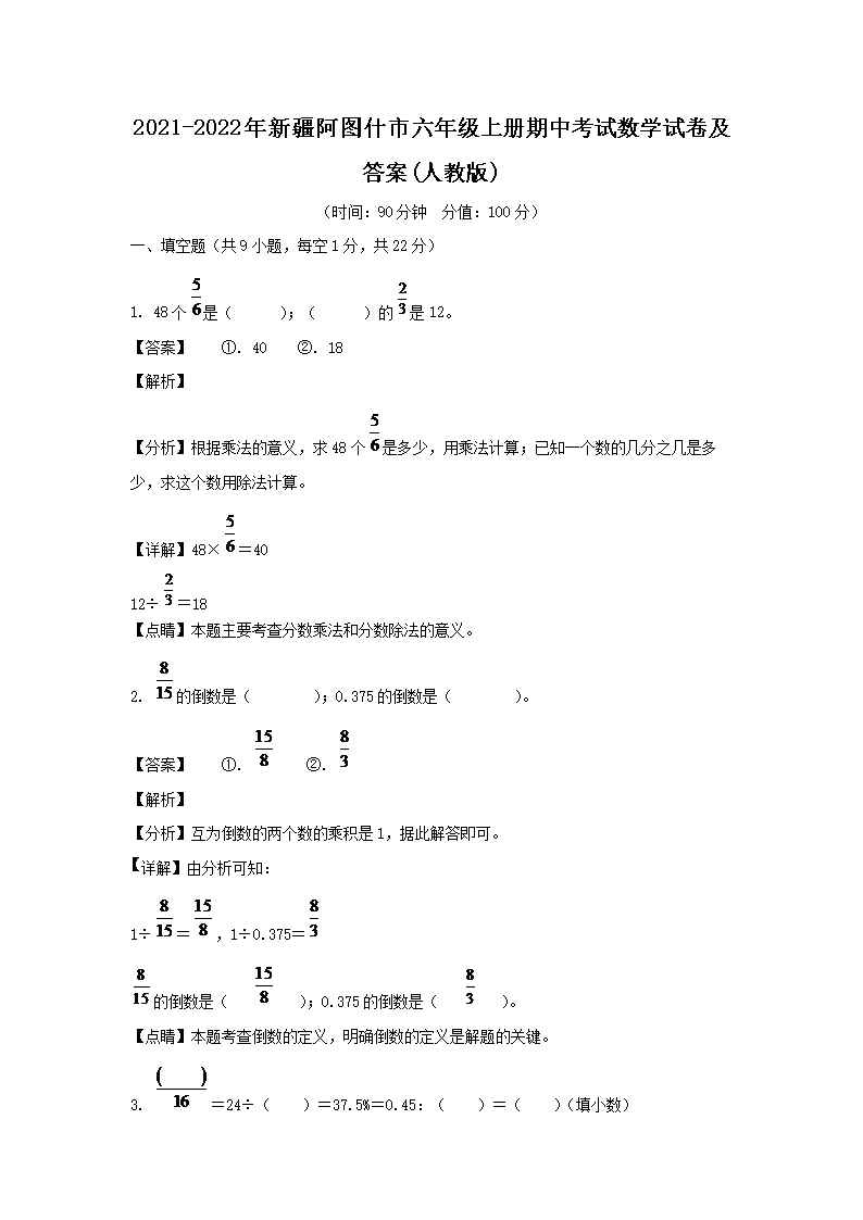 【文档预览】 文档大全网整理发布2021-2022年新疆阿图什市六年级上册期中考试数学试卷及答案(人教版)(Word版),前五页预览如下: