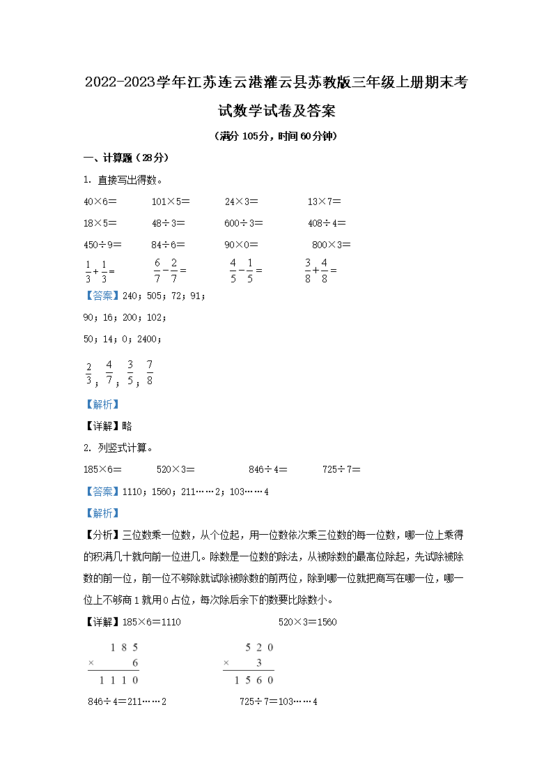 【文档预览】 文档大全网整理发布2022-2023学年江苏连云港灌云县苏教版三年级上册期末考试数学试卷及答案(Word版),前五页预览如下: