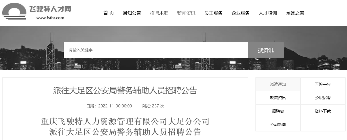 为加强社会治安管理,提高社会治安防控能力,有效缓解公安机关警力不足的现状,重庆飞驶特人力资源管理有限公司大足分公司受重庆市大足区公安局委托,采用派遣制方式面向社会公开招聘警务辅助人员(以下简称辅警)60人。本次招聘的辅警由重庆飞驶特人力资源管理有限公司大足分公司派往重庆市大足区公安局从事警务辅助工作。现将有关事项公告如下: