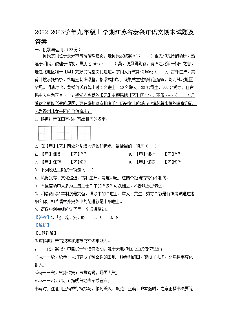 2022-2023学年九年级上学期江苏省泰兴市语文期末试题及答案(Word版)09-08